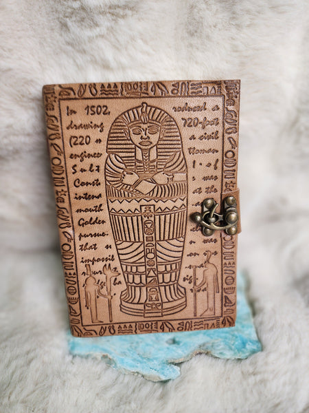 This handcrafted leather journal features a secure latch closure and a striking tomb motif on the front, surrounded by intricate Egyptian-inspired designs. Made from high-quality leather, it is both durable and visually captivating, offering a mystical and historical aesthetic for spiritual or creative practice.