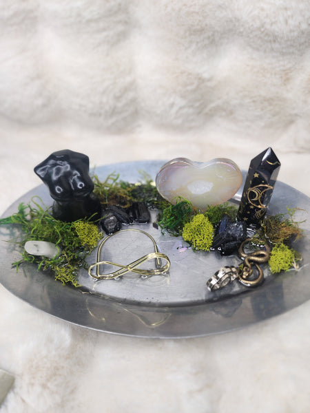 Embrace the power of the divine feminine and the mysteries of the night with this handmade altar, crafted atop a metal tray and designed to radiate both shadow and beauty. The piece centers around an obsidian goddess body carving, representing protection, grounding, deep intuition, and the sacred feminine.