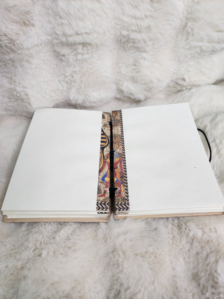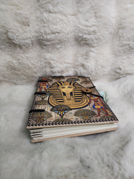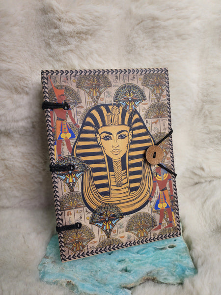 This handcrafted journal features a striking printed image of King Tutankhamun, celebrating ancient Egyptian heritage, royalty, and mystical wisdom. With a durable, high-quality cover and blank pages, it is perfect for writing, reflection, or magical practice without the use of leather.