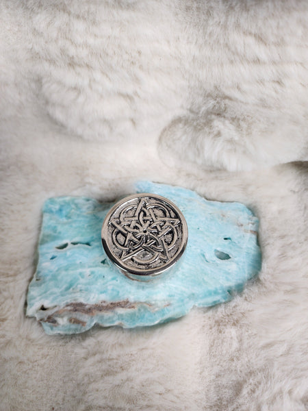 Enhance your altar or sacred space with this silver metal teacup candle holder, featuring a pentacle surrounded by geometric circles. The pentacle symbolizes protection, balance, and the elements, while the geometric patterns represent harmony, sacred geometry, and energetic alignment.