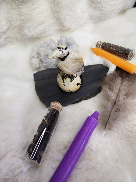 The raven, a symbol of transformation, mystery, and prophecy, amplifies this carving’s spiritual energy. Together, they create a powerful totem for insight, grounding, and awakening one’s inner truth.