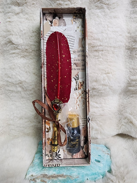 This striking red quill pen, beautifully spotted with gold accents, is paired with a coordinating ink set, making it a powerful and elegant tool for ritual writing, spellwork, and intentional correspondence. The vibrant red symbolizes passion, strength, love, and vitality, while gold accents represent success, power, and manifestation.