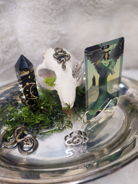 Step into the deeper, shadowed side of forest magick with this handmade altar, crafted on an antique metal tray that holds the energy of age and mystery. The base is lined with soft, natural moss, creating an earthy, wild setting for the ritual pieces it carries.