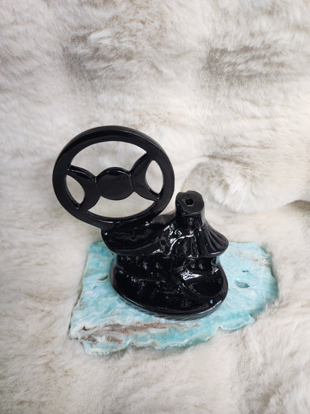 Enhance your ritual or meditation space with this black backflow incense burner, featuring a Triple Moon symbol—representing the Maiden, Mother, and Crone—etched behind the flowing smoke. Designed for backflow incense cones, the smoke cascades downward in a mesmerizing waterfall, creating a calming and magical atmosphere.